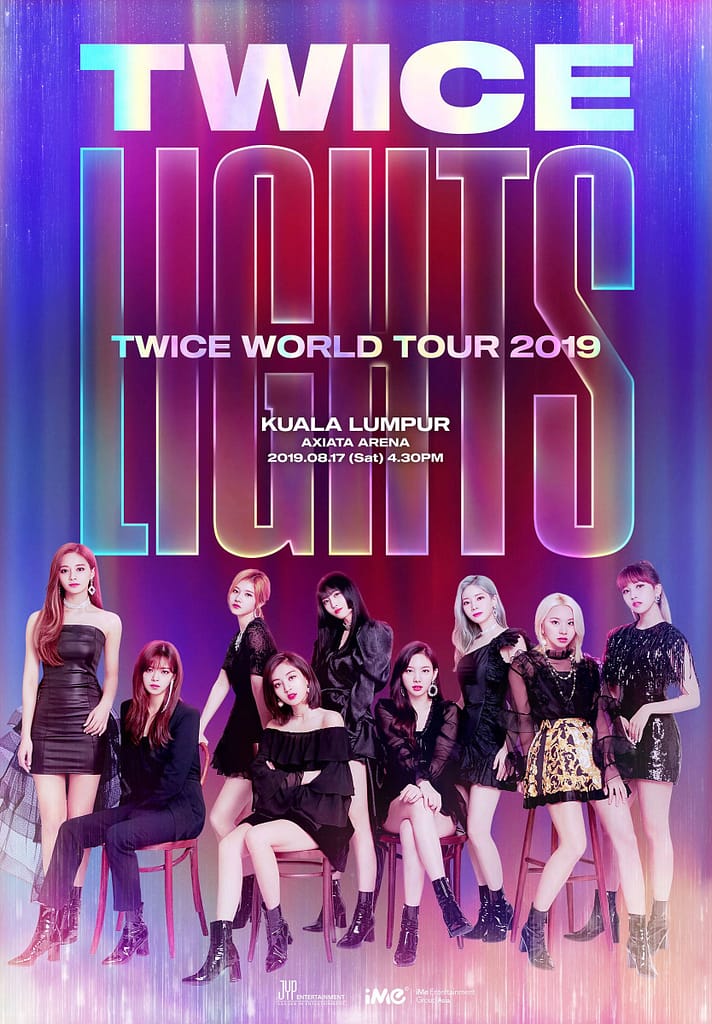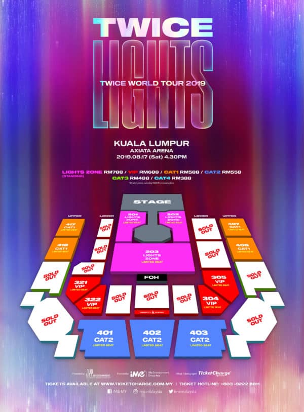 “TWICE WORLD TOUR 2019 ‘TWICELIGHTS’ IN KUALA LUMPUR” will be held at Axiata Arena on 17th August at 4:30pm. Tickets will be priced at RM788 (Lights Zone/Free Standing), RM688 (VIP), RM588 (CAT 1), RM558 (CAT 2), RM488 (CAT 3), RM388 (CAT4). Tickets will officially go on sale at Atria Shopping Gallery, Petaling Jaya on 15th June, starting from 10am to 4pm and online ticket sales will go live on the same day starting from 7pm onwards.