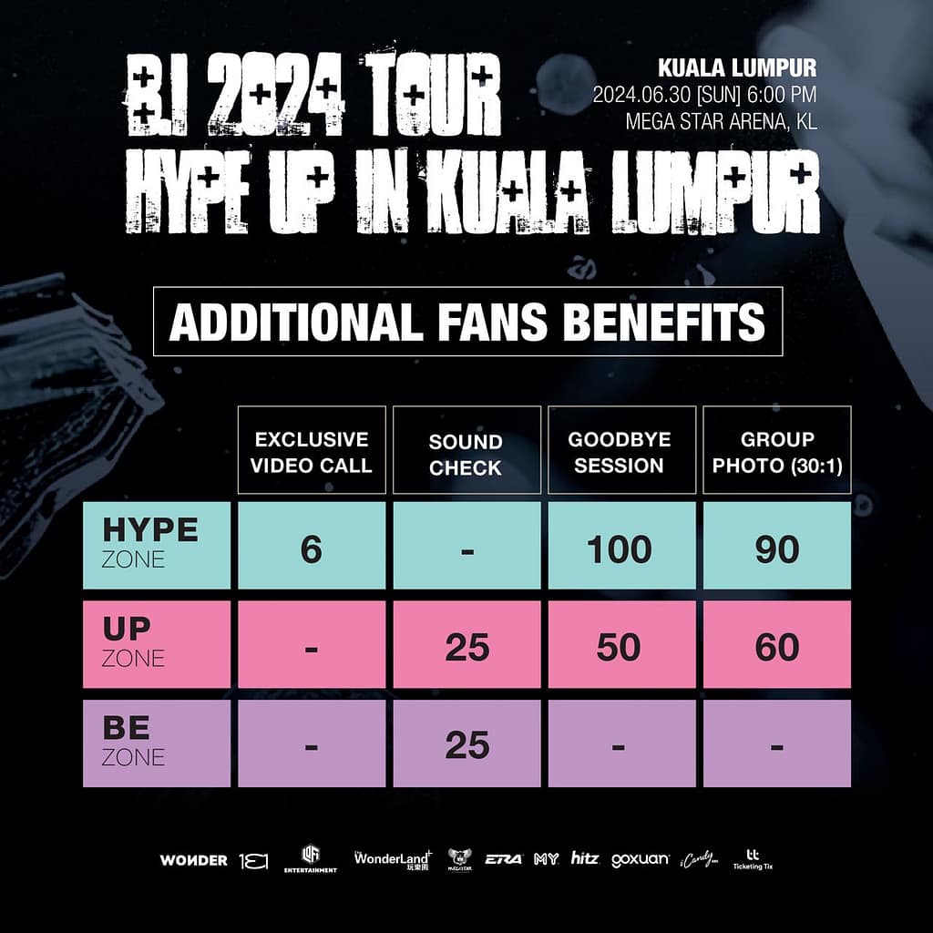 • UP Zone – RM688 : Additional Fan Benefits: Soundcheck for 25 fans, Goodbye Session for 50 fans, Group Photo for 60 fans (30 fans per group)