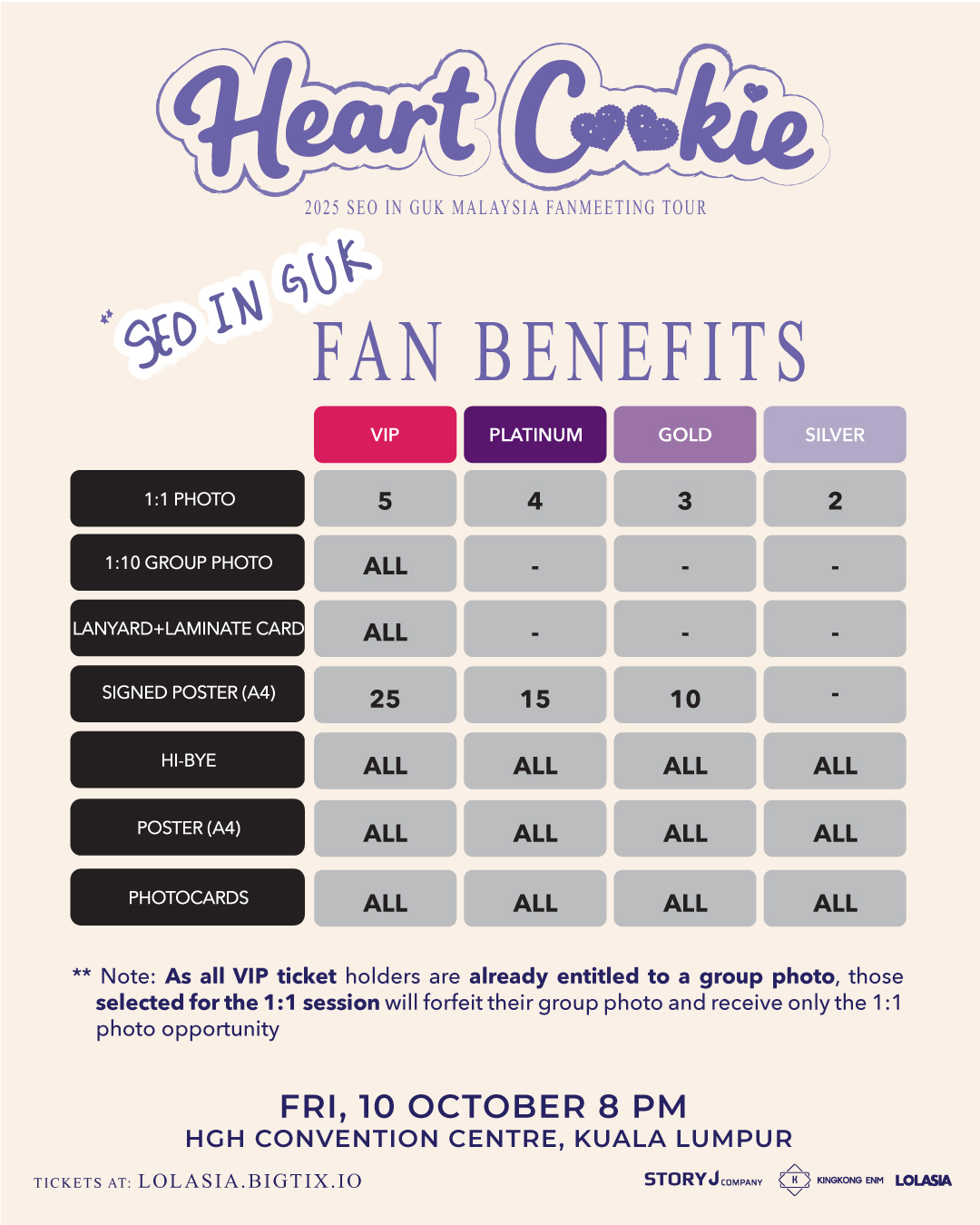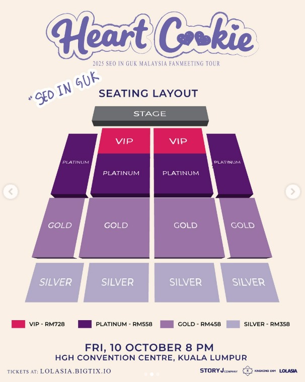 Tickets for the highly anticipated Kuala Lumpur stop of the “Heart Cookie” tour will officially go on sale on June 27, 2025, at 12 PM (MYT). Mark your calendars and prepare to secure your spot via lolasia.bigtix.io. So, get ready, Kuala Lumpur, for a night of sensational music, engaging interactions, and cherished memories with the one and only Seo In-guk!