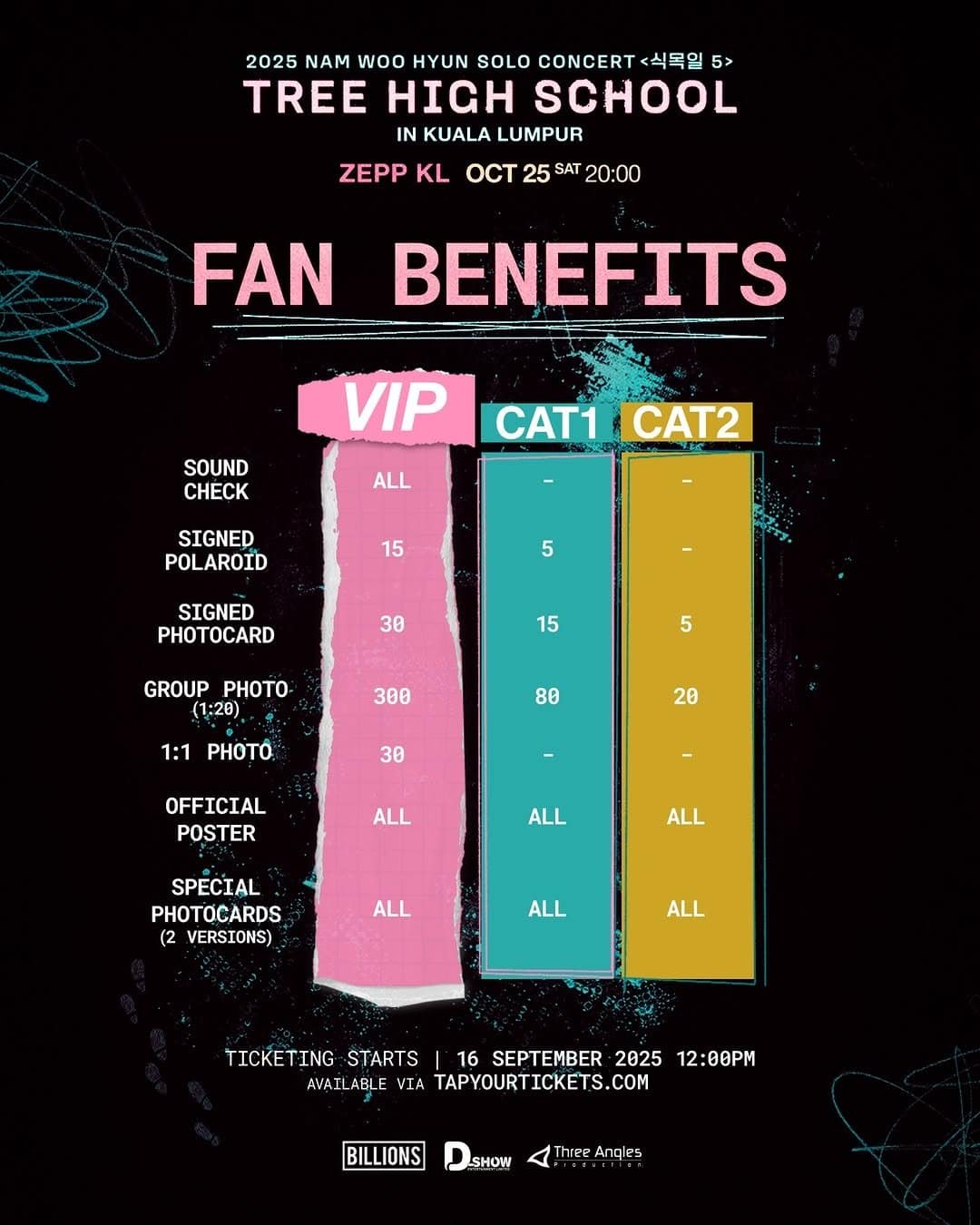 All VIP ticket holders will have access to the Soundcheck Session, while a limited number will be selected through a raffle for exclusive 1:1 Photo Opportunities. Additional fan benefits such as Group Photos, Signed Polaroids, and Signed Photocards will also be available via lucky draws. Every ticket category includes an Official Poster and Special Photocards as part of the concert merchandise package.